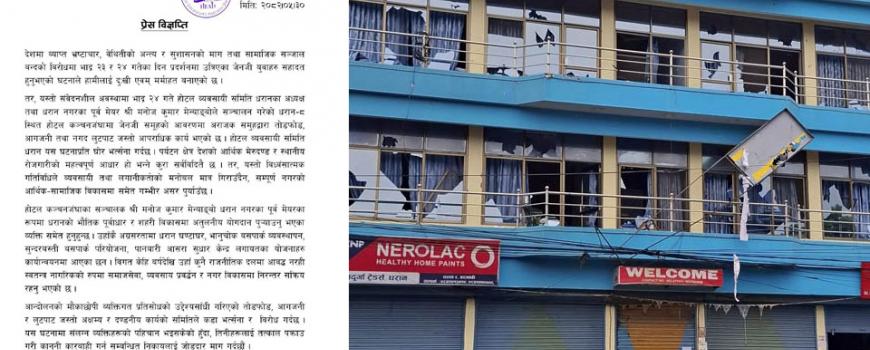 धरान : जेन-जी प्रदर्शनकारीको नाममा भदौ २४ गते धरान-८ स्थित होटेल कञ्जचनजंघामा अराजक समूहले तोडफोड र आगजनी गर्नेहरूलाई तत्काल पक्राउ गरी