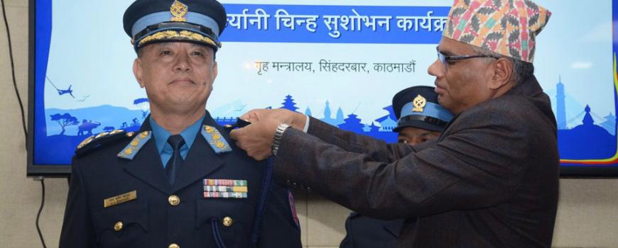 काठमाडौँ : नवनियुक्त प्रहरी महानिरीक्षक (आइजिपी) चन्द्रकुवेर खापुङ बिहीबार बिहान गृह मन्त्रालयमा आयोजित एक समारोहमा दर्ज्यानी चिन्हबाट