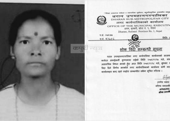 धरान : धरान उपमहानगरपालिकाको सफाईमा काम गर्ने स्थाई कर्मचारी कृष्णमाया राईको निधनका कारण आज बुधबार धरान उपमहानगरपालिका र २० वटै वडा कार