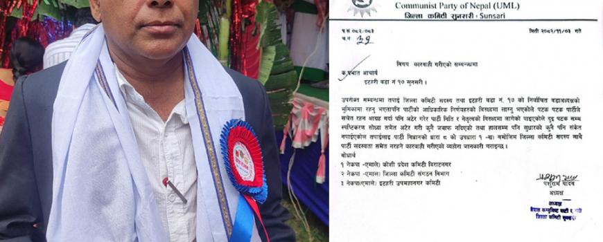 इटहरी : नेकपा (एमाले) सुनसरी जिल्ला सदस्य तथा इटहरी उपमहानगरपालिका वडा नम्बर १७ का वडा अध्यक्ष प्रभात आचार्य कारबाहीमा परेका छन् । पार्