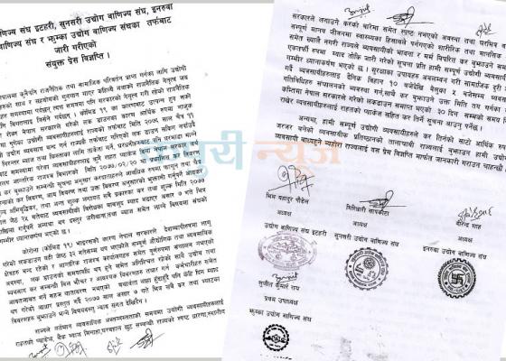धरान : सुनसरीका उद्योग वाणिज्य सङ्घहरूले संयुक्त विज्ञप्ति जारी गरी सरकारले असार ७ गते भित्र सबै कर तथा भ्याटका विवरणहरू बुझाउने भन्ने