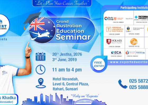 इटहरी:एक्सपर्ट एजुकेशन इटहरीले यही जेठ २० गते इटहरीमा बृहत् अष्ट्रेलियन एजुकेशन सेमिनार गर्ने भएको छ । होटल बरण्डाको सेमिनार हलमा बिहा