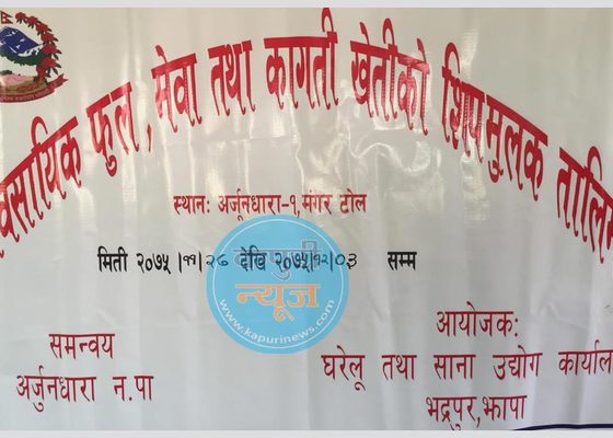 विर्तामोड : झापाको अर्जुनधारा नगरपालिका वडा नं. १ मा ७ दिवशिय व्यवसायिक फुल, मेवा तथा कागती खेती सम्वन्धि तालिम सम्पन्न भएको छ । अर्जु