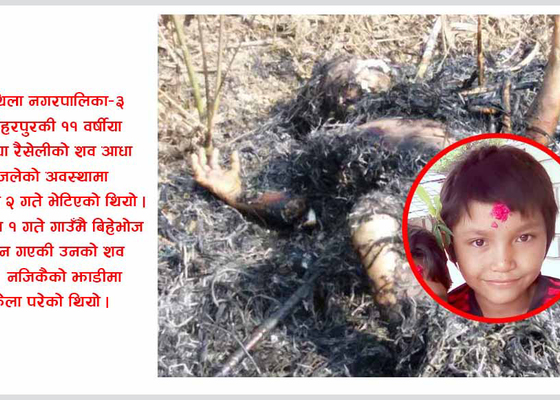 जनकपुरधाम : आधा शरीर जलेको अवस्थामा मृत भेटिएकी बालिकाको सामूहिक बलात्कारपछि हत्या भएको पाइएको छ । मिथिला नगरपालिका–३ हरिहरपुरकी