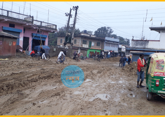 इनरुवा: मौषम परिवर्तन भएर बर्षा भएपछि निर्माणाधिन सुनसरीको हरिनगर गाउँपालिका वडा नम्बर १ र २ मा पर्ने मुख्य भुटाहा बजार क्षेत्रको बाटो