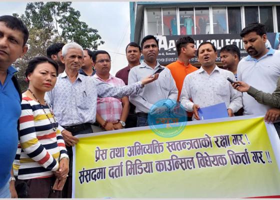 इटहरी : गत वैशाख २६ गते संसदमा दर्ता भएको मिडिया काउन्सिल विधेयक फिर्ता हुनुपर्ने मागसहित प्रदेश १ का पत्रकारहरुले इटहरीमा मानव साङ्लोम