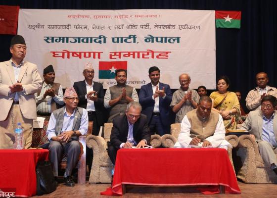 काठमाडौं: संघीय समाजवादी फोरम नेपाल र नयाँ शक्ति पार्टी नेपालबीच औपचारिकरुपमा पार्टी एकता भएको छ । काठमाण्डौंस्थित प्रज्ञा प्रतिष्ठानम