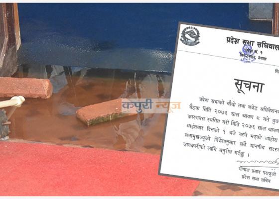 विराटनगर: बर्षातको पानी प्रदेश नं १ को सभाहल भित्र नै पसेर डुबान परेपछि संसदको बैठक १० दिनको लागि स्थगित गरिएको छ । आज बुधबार चौथो तथा