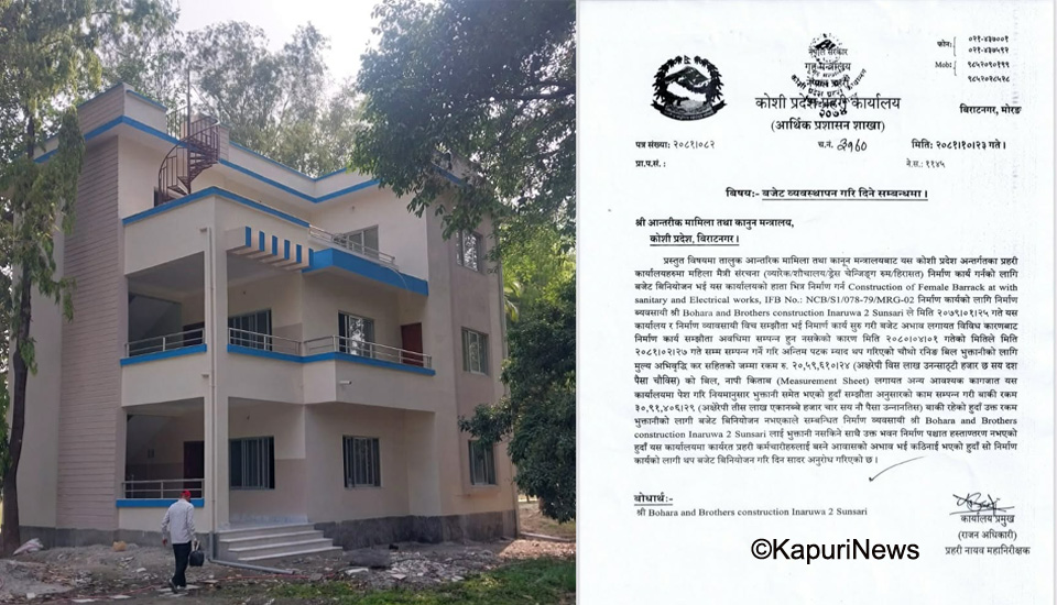 इटहरी : नेपाल प्रहरीको भवन निर्माणको जिम्मा पाएका निर्माण व्यवसायी भुक्तानी नपाएर समस्यामा परेका छन् । कोशी प्रदेश प्रहरी कार्यालय विरा